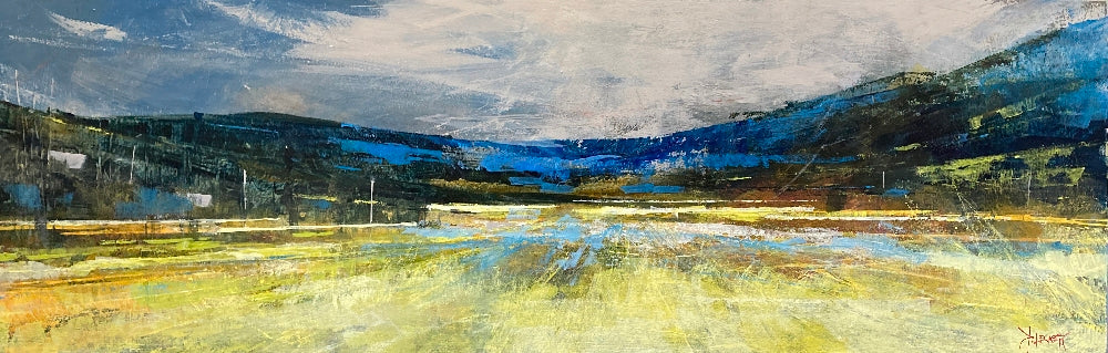 This work bursts with expressive energy, using bold colors and dynamic brushwork to convey a vibrant landscape. The foreground is awash with shades of yellow and green, suggesting sunlit fields or meadows, while the middle ground transitions into deeper blues and greens, hinting at distant hills or mountains. The sky is particularly striking, filled with light and dark clouds that add depth and movement to the scene. The brushstrokes are confident and textured, giving the painting a sense of motion and emotion. This combination of color, contrast, and expressive technique creates a visually engaging piece that feels alive.