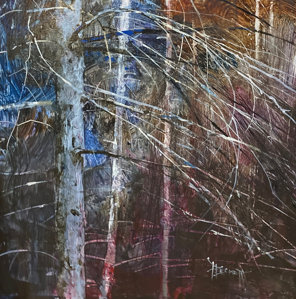 An abstract forest scene rendered in expressive strokes and layered textures. Tall, slender tree trunks in gray, white, and brown rise through a dynamic background of muted blues and reds, suggesting depth and movement. Crisscrossing lines evoke wind or the intricate weave of branches, creating a sense of rhythm and complexity. This piece captures the raw beauty of nature through a modern, atmospheric lens—ideal for collectors drawn to bold, textural landscapes.